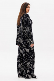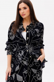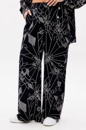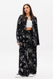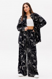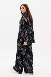 Брючный костюм, который с лёгкостью становится нарядным! Прежде всего, его выделяет роскошная ткань с геометрическим крупным рисунком, которая позволяет создать такой великолепный вариант брючного комплекта, который составит конкуренцию любому платью. Прямые линии, минимум декоративных элементов этот костюм как чистый лист, позволяет при помощи аксессуаров создать свои, неповторимые сеты. Свободная широкая рубашка и брюки-палаццо. Силуэт оверсайз, покрой рубашечный, воротник классический рубашечный с отрезной стойкой. Полоска, с отрезной кокеткой и накладным карманом. Спинка с отрезной кокеткой. Рукав с отрезной манжетой. Брюки на приточном поясе, эластичном в области спинки, с наклонными боковыми карманами. Длина рубашки около 75 см. Длина рукава с плечом около 74 см. Длина брюк около 108 см.