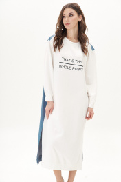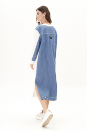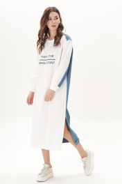 Модное платье - настоящее спасение для нерешительных. Не надо думать с чем сочетать, просто надеваешь и всё... Платье комбинированное, полочка и перед рукава трикотажные, спинка- джинсовая. Силуэт - оверсайз с заниженной линией плеча. покрой рубашечный. Полочка с декоративным принтом. Спинка с отрезной кокеткой, вертикальными рельефами и отрезным поясом с пуговицами-болтами. По боковым швам - разрезы. Рукав с отрезной локтевой частью из джинса. Длина платья 120см Длина рукава с плечом 74 см