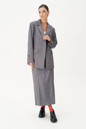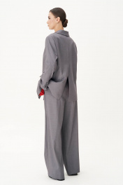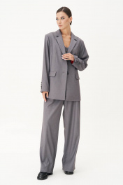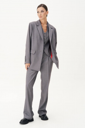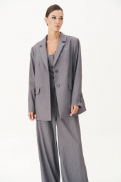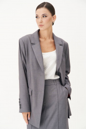 Жакет свободного расширенного силуэта, втачного покроя с центральной застёжкой и классическим английским воротником. Полочка с отрезным бочком, нагрудной вытачкой и прорезным карманом с клапаном. Спинка с центральным швом, высокой шлицей и отрезным бочком. Рукав двухшовный с отлетной шлицей и отделочными пуговицами. Длина жакета около 76 см. Длина рукава около 62 см.