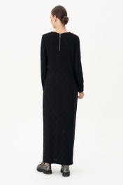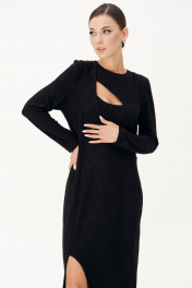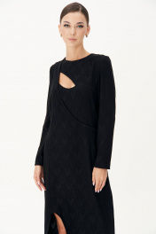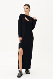 Модная осень сменяет модное лето, но непременно остаётся не менее эффектной и стильной. Элегантное трикотажное платье полуприлегающего силуэта с трендовым разрезом - открывающим загадочно ногу, и вырезом деликатно приоткрывающий зону декольте. Ассиметричный, сложный крой модели: односторонний рельеф, оригинальный подрез и отрезная кокетка с одной стороны полочки, преображают, казалось бы простое чёрное платье в необычно актуальное. Длина платья около 130 см Длина рукава около 62 см.