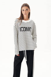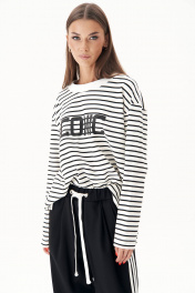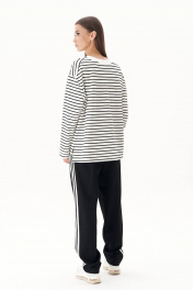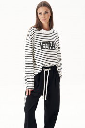 Дизайнерские интерпретации стилей и направлений в грядущем сезоне предложены образами, где строгие костюмы отлично сочетаются с кроссовками и кедами, но также спортивные костюмы могут выглядеть довольно стильно, представляя модели в стиле спорт-шик. Ультрамодные брюки с лампасами в стиле ""adidas"" с вертикальными боковыми карманами с листочкой, поясом с эластичной тесьмой, люверсами и отделочным шнуром. Свитшот свободный, с заниженной линией плеча, рубашечным рукавом, зауженным к низу, разноуровневым низом и авторским принтом. По горловине тельма-довяз. Длина брюк около 106 см. Длина свитшота около 77 см. Длина рукава с плечом 74 см.