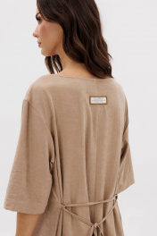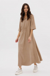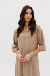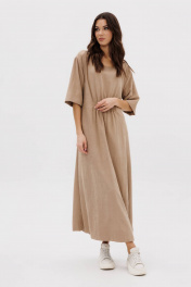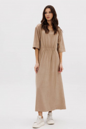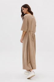 Платье в стиле кэжуал-это комфорт, простота, удобство кроя в сочетании с непринужденностью и универсальностью. Свободный А-силуэт, рубашечный покрой с заниженной линией плеча, рукав, длинной до локтя, изящная круглая горловина. Полочка с декоративным элементом с эластичной тесьмой. Спинка со средним швом, поясом-шнурком, и декоративной нашивкой. Длина платья около 127 см. Длина рукава с плечом около 40см.