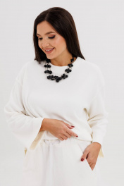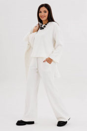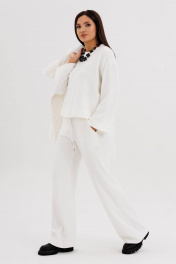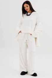 Такой вариант неформального костюма можно отметить отдельно-это настоящий шик, который в любой обстановке смотрится по-особенному. Невероятное ощущение расслабленности и комфорта обеспечивает удобный покрой и тактильно уютный трикотаж с эффектом вельвета. Брюки свободного кроя, прямые, с наклонными боковыми карманами , на эластичном поясе с люверсами и отделочным шнуром. Джемпер рубашечного покроя, свободный, слегка укороченный. Горловина круглая с притачной обтачкой. Рукав рубашечный расширенный к низу. Длина джемпера около 57 см. Длина рукава с плечом около 74 см. Длина брюк около 105 см.