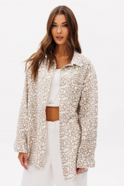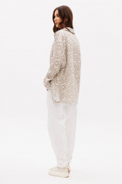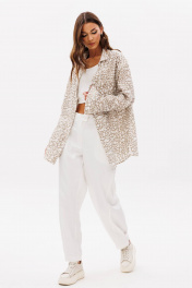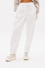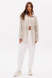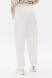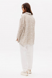 Комплект, в котором ведущую роль играет муслиновая рубашка, а дуэтом с ней выступают брюки- "barrel". Рубашка свободного покроя, с заниженной линией плеча, рубашечным воротником, центральной застежкой на петли и пуговицы и рубашечным рукавом на манжете. Брюки покроя "barrel", расширенные в области икры и зауженные к низу. Пояс притачной, эластичный в области спинки. По передним половинкам брюк-застежка и боковой наклонный карман. По задним-вертикальный шов. Боковой шов смещен в сторону центра передних половинок брюк. По низу-пата с регулирующими пуговицами, позволяющая создавать разную ширину брюк внизу. Длина рубашки около 77 см. Длина рукава с плечом около 74 см. Длина брюк около 100 см