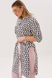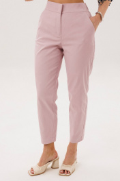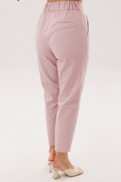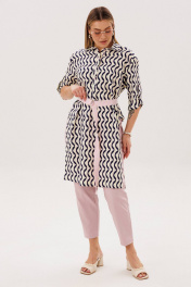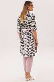Костюм женский 2-х предметный. Вещи из комплекта легко сочетаются с другими предметами гардероба. Костюм мастерски скрывает недостатки фигуры, при этом вполне может соответствовать дресс-коду. Комплект состоит из удлинённой рубашки-туники и брюк. Туника выполнена из вискозного материала что делает её воздухопроницаемой, гигроскопичной. Застёжка по переду на длиной планке-«поло», воротник рубашечный на отрезной стойке. Боковые части длиной чуть ниже линии талии в сочетании с длинными спинками и передом делает модель оригинальной. Рукава выточены на спущенной линии плеча с отрезными манжетами. Длина ниже локтя с регулировкой на патах. Спинка с горизонтальной кокеткой и бантовой складкой. Брюки на широком приточном поясе с эластичной лентой по спинке, зауженные к линии низа. Имеют наклонные боковые карманы и имитацию кармана с листочкой на задней половинке. Длина блузки по спинке 99 см. Длина брюк 97 см