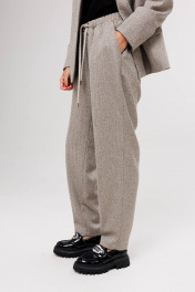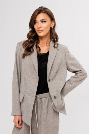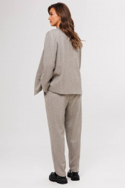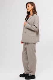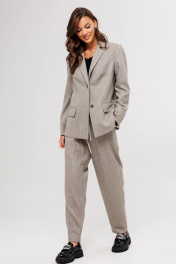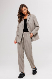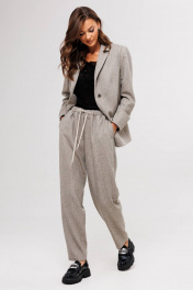 Стильный образ - это главный принцип современной моды. Уверенно и неординарно - так мы должны себя чувствовать в хорошей одежде, а лучшим помощником для создания лука станет брючный костюм. Комплект 2-х предметный. Силуэт свободный, слегка упрямлённый, покрой-втачной, воротник классический английский, линия борта фигурная, застёжка на две петли и пуговицы. Полочка с отрезным бочком, нагрудной вытачкой и прорезным карманом с клапаном. Спинка со средним швом и талиевой вытачкой. Рукав двухшовный с отлетной шлицей и отделочными пуговицами. Брюки свободные, на эластичном поясе с люверсами и отделочным шнуром. Передние половинки с боковыми накладными карманами. Длина пиджака около 67 см, длина рукава около 60 см. Длина брюк около 98 см
