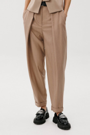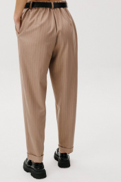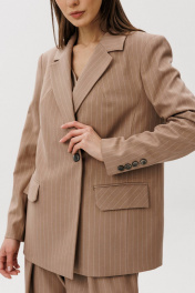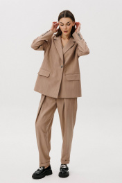 Прилежный officecore с накрахмаленными до хруста воротничками, начищенными до блеска "" оксфордами"" и портфелями, набитыми под завязку документами, официально отменяется. Офисный look образца 2025 выглядит так, словно его пропустили через шредер, а затем собрали заново. Невероятная тройка-как воплощение нового видения на классический костюм. Жакет свободного упрямленного силуэта, втачного покроя, со смещенной застежкой и классическим английским воротником. Полочка с нагрудной вытачкой от линии лацкана, меняющей направление полоски в верхней части, прорезным карманом с рамкой и клапаном. Спинкка с плечевой вытачкой и двумя необычными шлицами, идущими от горловины спинки, фиксирующимися пуговицами в области талии. Центральная часть спинки в диагональном направлении. Рукав двухшовный с отлетной шлицей и пуговицами. Жилет полуприлегающий, со сложным фигурным бортом, отрезным бочком, нагрудной вытачкой и средним швом и рельефом по спинке. Брюки современного кроя, свободные вверху и зауженные к низу на притачном поясе со шлевками, эластичном в области спинки. Передние половинки брюк с наклонным боковым карманом и большой односторонней складкой, визуально преобразующей прямую полоску в наклонную от центра передних половинок к боковому шву. Задние половинки брюк с талиевыми вытачками. По низу брюк-цельнокроеный манжет. Длина жакета около 67 см. Длина рукава около 62 см. Длина жилета около 54 см. Длина брюк около 100 см.