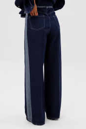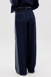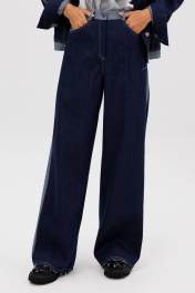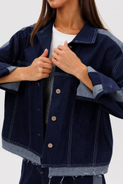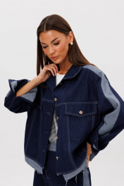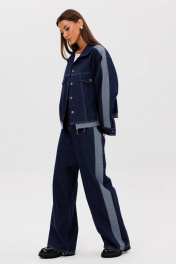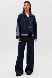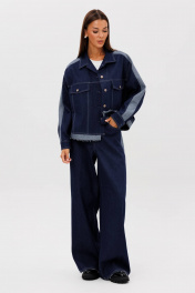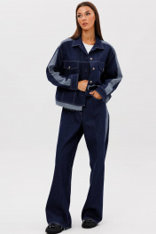 Костюм состоит из куртки и брюк. Свободный силуэт, рубашечный покрой, втачной воротник, рукав с притачной манжетой. Полочка с отрезной кокеткой, рельефами и карманом с клапаном. Спинка с отрезной кокеткой и рельефами. Рукав с локтевым швом и разрезом в нём, отделочным лампасом по центру рукава из контрастного денима, мягкой складкой и притачной манжетой. По низу куртки - притачная отделочная полоса в цвет лампаса. Застёжка центральная на петли и пуговицы. Джинсы классического покроя, свободные, с 5-ю карманами. По боковому шву - лампас из отделочного денима, также в цвет лампаса подзоры боковых карманов и пояс. Низ брюк обработан полоской с открытым срезом. Длина куртки около 52 см. Длина рукава с плечом около 74 см. Длина брюк около 105 см"