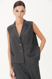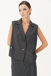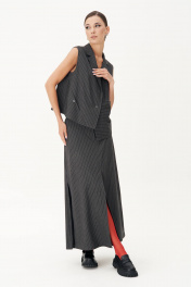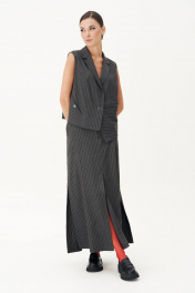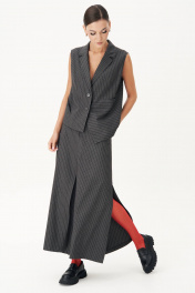 Костюм с жилетом - прекрасное решение для смелых экспериментов. Выполненный в ахроматической цветовой гамме, он позволяет дополнять себя различными аксессуарами и создавать каждый раз новые актуальные образы. Жилет прямого силуэта с центральной застёжкой и фигурным разноуровневым бортом. Спинка с декоративной разноуровневой планкой, которая иммитирует застежку.Юбка А-образного силуэта с центральным швом с высоким разрезом по переднему полотнищу. Заднее полотнище с центральным швом, отрезной кокеткой, в швах которой карманы,и застёжкой на тесьму-молнию. Пояс отрезной с эластичной тесьмой по спинке. По боковым швам - наклонный карман.