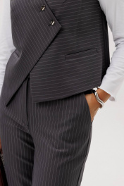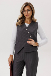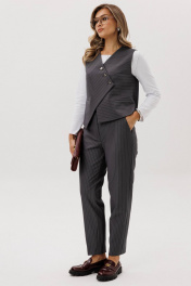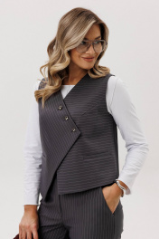Стильный женский костюм в полоску — идеальное сочетание элегантности и современного минимализма. Комплект состоит из жилета оригинального кроя с асимметричной застёжкой, брюк и джемпера с длинным рукавом. Модель выполнена из плотной трикотажной ткани с тонкой вертикальной полоской, которая визуально вытягивает силуэт и подчёркивает стройность. Жилет без рукавов застёгивается на декоративные пуговицы, создавая выразительный акцент в образе. Брюки классические, прямые. Джемпер трикотажный, с длинным рукавом, полуприлегающего силуэта. Костюм легко комбинируется с базовыми лонгсливами, водолазками или блузками, подходит для офиса, деловых встреч и городских образов.