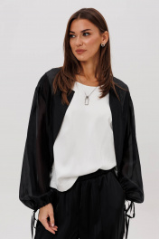 Эффектный ансамбль-тройка, в котором каждая деталь работает на утончённый и современный образ. Полупрозрачный блузон из воздушной вискозной органзы создаёт легкую дымку и добавляет образу благородной загадочности, а акцентные завязки подчёркивают талию и делают силуэт более выразительным. Контрастный атласный топ вносит нотку сияния и гармонично освежает тёмную гамму комплекта. Широкие атласные брюки со стрелкой и комфортным эластичным поясом добавляют образу сдержанной элегантности и подчёркивают его продуманную роскошность. Такой комплект смотрится нарядно, современно и effortlessly chic — идеальный выбор для тех, кто любит сочетание лёгкости, динамики и безупречного стиля.