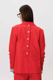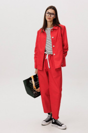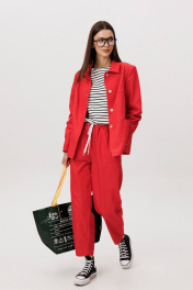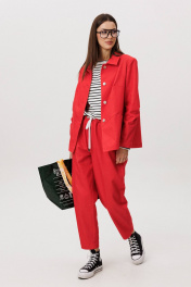 Динамичный костюм-тройка, построенный на контрасте цвета, фактуры и расслабленного кроя. Жакет и брюки выполнены из плотного цветного денима, который придаёт образу структуру и выразительность, сохраняя при этом комфорт повседневной носки. Лаконичный крой подчёркивает современный городской характер модели. Лонгслив в контрастную полоску добавляет образу графичность и визуальную лёгкость, создавая эффект продуманной многослойности. Брюки на эластичном поясе дополнены люверсами и отделочным шнуром — функциональная деталь, которая усиливает casual-настроение и подчёркивает дизайнерский подход. Комплект легко стилизуется под активный городской ритм, идеально подходит для повседневных образов и сочетает в себе комфорт, актуальный дизайн и яркую индивидуальность.