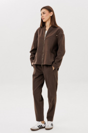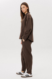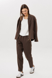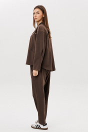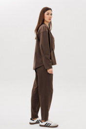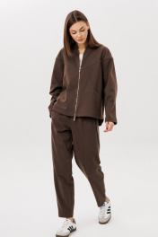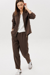 Костюм, где главный акцент-индивидуальность в сочетании со спортивными элементами и экологичными материалами, это модель, где главное удобство и естественность. Он подходит абсолютно всем, не ограничивает в выборе и позволяет чувствовать себя комфортно в любой ситуации. Свободный силуэт, комбинированный покрой, центральная застежка на тесьму-молнию, капюшон рукав-частичный реглан с отрезной широкой манжетой и мягкой складкой в области локтя. Полочка с отрезной кокеткой и фигурным рельефом, переходящим в карман. Спинка с отрезной кокеткой. Брюки свободные, на эластичном поясе в области спинки, с фигурными вертикальными рельефами по центру передних и задних половинок, вытачками в области колена и боковым наклонным карманом. В комплекте топ прилегающего силуэта без рукава. Длина брюк около 100 см. Длина куртки около 70 см. Длина рукава с плечом около 74 см