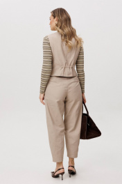 Костюм с жилетом - прекрасное решение для смелых экспериментов. Жилет полуприлегающего силуэта с асимметричной застёжкой, фигурной линией низа и регулирующийся кулисе по спинке. Полочки с отрезным бочком и нагрудными вытачками, спинки - с центральным швом, отрезным бочком и регулирующийся кулисой с фиксаторами. Брюки "баррел" на притачном поясе со шлёвками (эластичном в области спинки), с наклонными карманами , мягкими складками защипами по верху брюк и вытачками по низу. Джемпер с длинным рукавом, полуприлегающего силуэта.