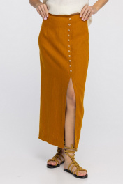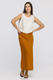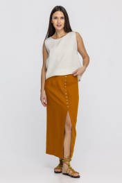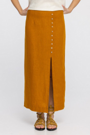 Юбка из 100% льна прямого силуэта с разрезом и декоративными пуговицами. Застежка на молнию и пуговицу. По переду и спинке выполнены талиевые вытачки