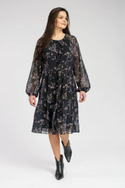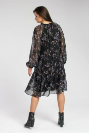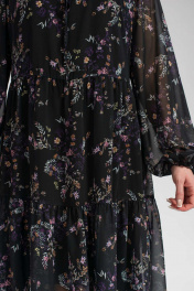 Легкое романтичное шифоновое платье. На подкладке. Горловина округлой формы собрана на шнурок. Рукав реглан без подкладки на резинке по низу. Отрезное по талии с двумя ярусами воланов на сборке. Длина миди. Длина изделия: 103см, длина рукава: 74,5см.