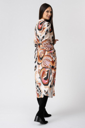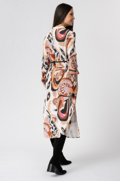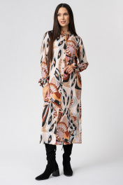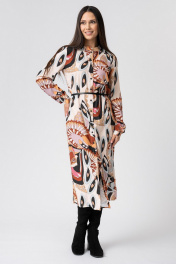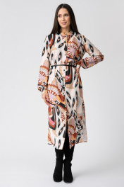 Платье женское с центральной бортовой застежкой на 11 пуговиц, с воротником-стойкой, с разрезами по бокам. Платье идет в комплекте с поясом из искусственной кожи. В боковых швах обработаны карманы. Длина спинки 119 см, длина рукава - 62 см