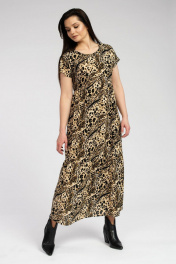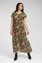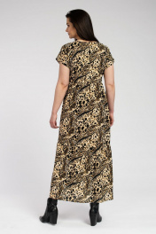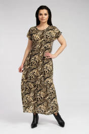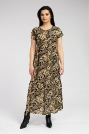 Платье полуприлегающего силуэта. Без подкладки. Горловина круглая с застежкой на пуговицу на спинке. Короткий рукав. Длина макси, отрезное со сборкой по талии с широким воланом по низу. Выполнено из струящейся вискозы. Длина изделия: 130см.