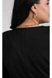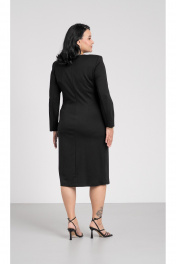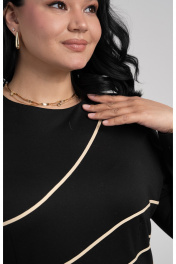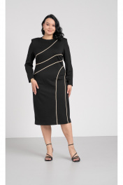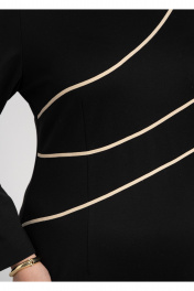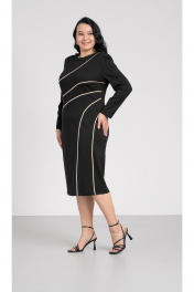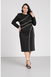 Платье женское с застежкой на тесьму-молнию, расположенную в среднем шве спинки. Перед с двумя нагрудными вытачками, направленными от боковых швов; с двумя таллиевыми вытачками. Перед платья с отделкой в виде настроченной отделочной эластичной тесьмой контрастного цвета в пять рядов, расположенных в разном направлении. Спинка со средним швом, с двумя таллиевыми вытачками. Рукава втачные, длинные, двухшовные: с передними и локтевыми швами. Платье без воротника, с круглой горловиной, обработанное обтачкой. Платье без подкладки, с плечевыми накладками.