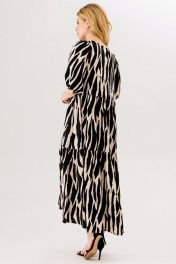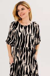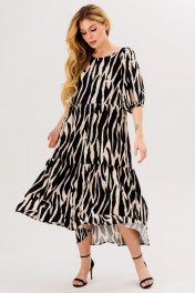Вырез горловины: округлый Дополнительное описание: платье отрезное, с воланом по низу. В боковых швах- карманы. Низ асимметричный- спереди короче, сзади- длиннее.