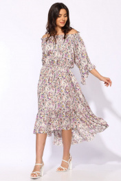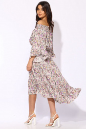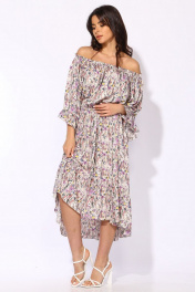 платье со сборкой на резинку по талии. Низ платья асимметричный, с воланом. Силуэт: полуприлегающий Тип ткани: вискоза Вырез горловины: со сборкой на резинку, с рюшей по верху Длина изделия: по спинке - 120см Длина рукава: 42см, рукав широкий, асимметричный, с воланом по низу.