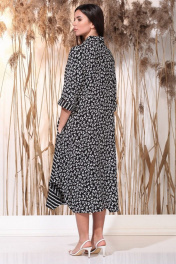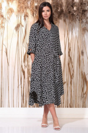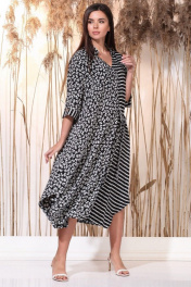 Комплектация: платье Силуэт: свободный Тип ткани: вискоза Вырез горловины: V образный ,в котором обработан воротник на стойке Длина изделия: по среднему шву спинки - 115 см Длина рукава: втачной - 38 см Дополнительное описание: карманы в швах ,пояс втачной