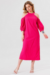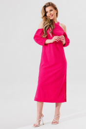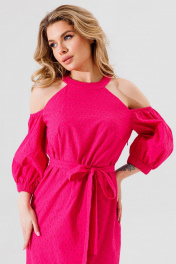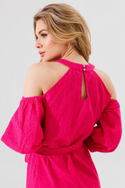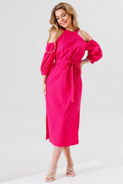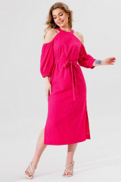 Платье прямого силуэта из хлопковой ткани. Вырез горловины американская пройма, на планке, с застежкой на навесные петли и пуговицы. Длина изделия: по спинке - 118см Длина рукава: 35см, рукав широкий, собран на резинку. В боковых швах платья- разрезы. Платье на подкладке. В комплекте- узкий съемный пояс из основной ткани.