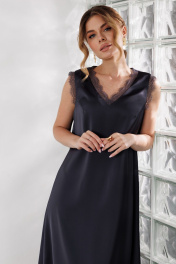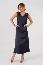 Нарядное платье из плотного атласного полотна, свободного силуэта,расширенное книзу, без подкладки, длины макси. Горловина и проймы отделаны кружевом в цвет основной ткани.