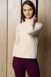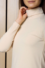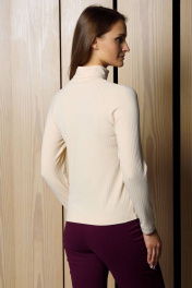Джемпер женский с воротником-стойкой молочного цвета составит интересный образ с классическими брюками осенью и зимой. Водолазка приталенного силуэта длиной выше линии бедер, хорошо садится по фигуре. У модели узкий рукав длиной 7/8. Отличает данную модель особый крой рукава – реглан, он придает исключительную мягкость изделиям и делает линию плеч закругленной.
