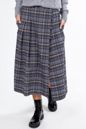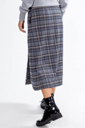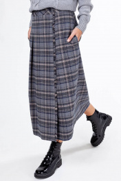 Стильная юбка А-образного силуэта из мягкой костюмной ткани в клетку на запах.Дополнительный объем юбке для свободного движения придают две складки, застроченные сверху.Верхняя деталь юбки по срезу декорирована модным элементом "бахрома".В боковых швах карманы. Идеальный вариант под куртку или полушубок с ботильонами или ботинками.