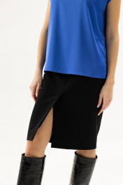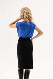 Лаконичная юбка-карандаш на подкладке , зауженная книзу , длиной ниже колена на 5 см. Спереди юбки имеется фигурный рельеф со шлицей и декоративная деталь с пряжкой. Застегивается модель сзади на потайную молнию.Такая модель юбки легко вписывается в любой гардероб.