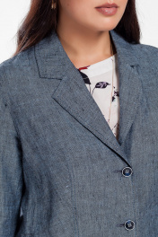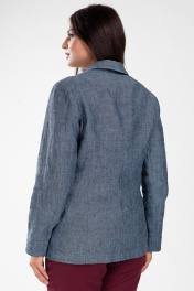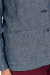 Жакет женский полуприлегающего силуэта, с центральной бортовой застежкой на три петли и пуговицы до перегиба лацкана. Перед с двумя карманами с листочкой. С двумя рельефными швами от проймы до низа, и двумя талиевыми вытачками до кармана. Спинка со средним швом и двумя рельефными швами от пройм. Рукава двухшовные, длинные. Воротник пиджачного типа.