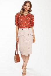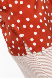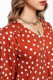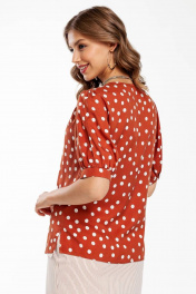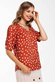 Блузка полуприлегающего силуэта с длинной чуть ниже линии бедер. Блузка выполнена из лёгкой струящейся вискозы. Перед блузки на кокетке со сборками. Горловина V-образный вырез. Акцент в изделии сделан на трендовый рукав до локтя -объемный благодаря складке по окату и сборке на манжете с застежкой на петлю и пуговицу. Низ изделия фигурный с разрезами. Блузка подойдет для создания комфортных образов с юбками, джинсами или брюками.
