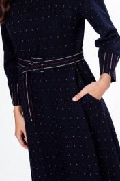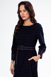 Платье женское, расширенное книзу, с круглым вырезом горловины, обработанным обтачкой. Застежка на потайную тесьму-молнию в среднем шве спинки. Отрезное чуть выше линии талии. Съёмные пояс, застёгивающийся на пряжку, протянутый через шлёвки по боковым швам. Верхняя часть переда с рельефными швами из пройм, с двумя нагрудными вытачками из рельефов. Нижняя часть с боковыми карманами в швах притачивания бочков. Спинка с средним швом. Верхняя часть спинки с рельефными швами. Рукава - реглан, двухшовные, длина 3/4. По низу с манжетами, выкроенными на изнаночную сторону, застёгивающимися на три петли и пуговицы.