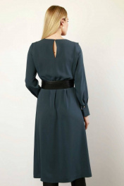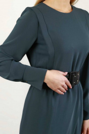Платье расширенного силуэта книзу, длина ниже линии колена. Вырез горловины круглый. Платье с подрезом по линии талии. Верхняя деталь с 2-мя рельефами и 2-мя вставленными в подрез заутюженными полосками шириной 2,5-3 см. По переду нижняя деталь с имитацией запаха.По спинке верхняя деталь с застёжкой на петлю и пуговицу в среднем шве. Рукав втачной, длинный. Манжета с застежкой на петлю и пуговицу. Ширина манжеты 10 см. В комплекте - съемный пояс из экокожи с обтяжной пряжкой. Универсальная модель на все случаи жизни. Для стабильной формы используется специальный вид прокладочных материалов и клеевой кромки для горловины. Параметры манекеншиц: Рост - 179см. Обхват груди - 89см. Обхват талии - 65см. Обхват бедер - 95см. Измерения изделия: Рост - 170см. Обхват груди - 88см. Обхват талии - 67,6см. Обхват бедер - 96см. Длина изделия -117,1см