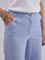 Современные повседневные женские брюки, выполнены в прямом силуэте. Имеют трендовую длину 9/10. Для удобства в боковых швах предусмотрены карманы. В качестве дополнительной декорации по спинке расположены накладные карманы и фигурная кокетка. Застежка на тесьму молнию, петлю и пуговицу. Произведены в однотонном светлом небесно-синем оттенке, вполне уместны светлые монохромные образы, принты, а также возможность поиграть на контрастах .Прямой крой имеет ряд преимуществ:позволяет чувтствовать комфорт в движении, скрывает то, что вы хотите скрыть, актуальны и современны достаточно долгий период времени.Прямые брюки " маленькое черное платье" - в мире брюк.