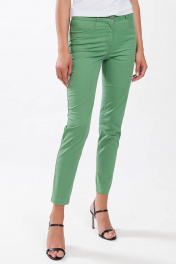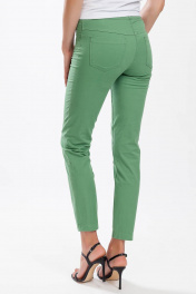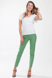 Брюки женские, зауженные книзу, на подкройном поясе с пятью шлевками. Застежка по среднему шву передних половин на тесьму-молнию, петлю и пуговицу по концам пояса. Передние половины с двумя боковыми карманами в швах притачивания бочков. Задние половины с двумя кокетками и с двумя фигурными накладными карманами.