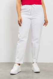 Женские укороченные брюки длиной 9/10 немного зауженные книзу. Спереди у модели имеются подрезы, шлевки и имитация гульфика. Для хорошей посадки брюк сзади имеется кокетка и имитация кармана с листочкой. Пояс 4 см с частично вставленной резинкой со шнурком.Модные брюки из плотной ткани будут с комфортом носиться в качестве повседнедных ,выбираться для создания стильного современного наряда на корпоратив или работы в офисе.