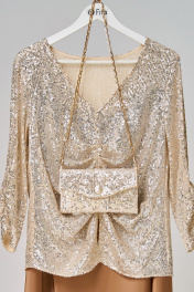 Нарядная блузка выполнена из мягкой трикотажной сетки в пайетки. Блузка полуприлегающего силуэта с драпировкой по полочке. Горловина в блузке v-образной формы, по низу разрез. Рукава в блузке втачные, одношовные, по низу рукава две декоративных складки. Низ изделия и низ рукавов обработаны бейкой, застроченной на 0,7 мм. "Зария" — сияющий акцент вашего новогоднего образа. Блузка, расшитая пайетками, ловит свет при каждом движении.