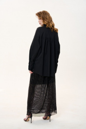 Рубашка оверсайз. Характеристики: свободный силуэт, выполнена из рубашечной ткани в черном цвете, центральная застежка на петли и пуговицы, по спинке отрезная кокетка и сборка, низ рукава обработан манжетой на петли и пуговицы. Длина рубашки по переду 78,5 см, длина рукава 55,5 см.