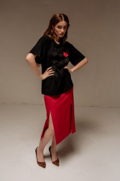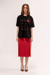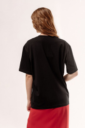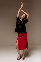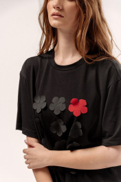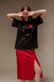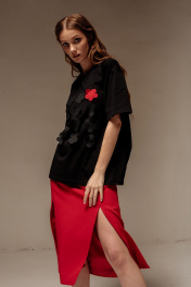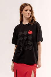 Майка свободного силуэта со спущенным рукавом. Характеристики: выполнена из трикотажного полотна в черном цвете, по переду декоративные цветы, по горловине обработана планка, рукав укороченный. Длина майки по переду 67 см, длина рукава 22 см.