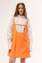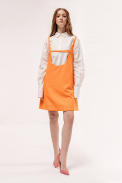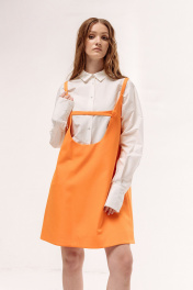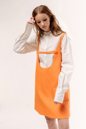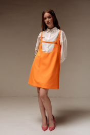 Сарафан прямого силуэта на подкладке. Характеристики: выполнен из плательной ткани в оранжевом цвете, по горловине переда обработан декоративный хлястик на петлю и пуговицу. Длина по переду 86 см.