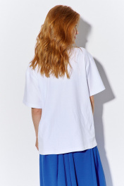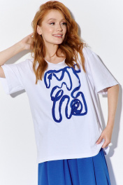 Майка свободного силуэта со спущенным рукавом. Характеристики: выполнена из трикотажного полотна в белом цвете, по переду декоративная аппликация, по горловине обработана планка, рукав укороченный. Длина майки по переду 69 см, длина рукава 22 см.