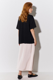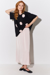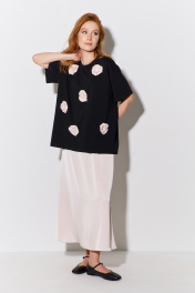 Комплект майка с юбкой. Майка свободного силуэта со спущенным рукавом. Характеристики: выполнена из трикотажного полотна в черном цвете, по переду декоративные объемные цветы, по горловине обработана планка, рукав укороченный. Длина майки по переду 67 см, длина рукава 21 см. Юбка А-силуэта. Характеристики: выполнена из шелковой ткани в бежевом цвете, верх юбки обработан эластичной тесьмой. Длина юбки: 93 см.