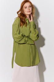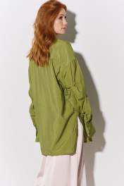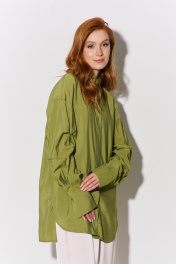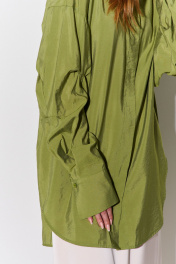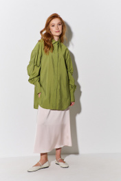 Рубашка свободного силуэта с декоративными рукавами. Характеристики: свободный силуэт, выполнена из рубашечной ткани в оливковом цвете, центральная застежка на петли и пуговицы, по спинке отрезная кокетка и складка, по рукаву декоративные защипы, низ рукава обработан манжетой на петли и пуговицы. Длина рубашки по переду 82,5 см, длина рукава 55 см.