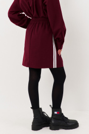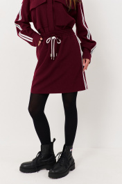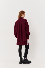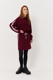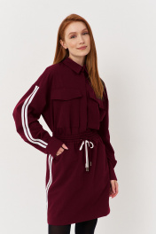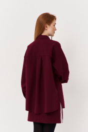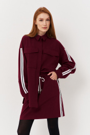 Комплект: рубашка с юбкой. Рубашка свободного силуэта с накладными карманами. Характеристики: свободный силуэт, выполнена из костюмно-плательной ткани в цвете марсала, по полочкам накладные карманы, центральная потайная застежка на петли и пуговицы, по спинке отрезная кокетка и складка, по рукавам контрастные лампасы, низ рукава обработан манжетой на петли и пуговицы. Длина рубашки по переду 78 см, длина рукава 54 см. Юбка с карманами прямого силуэта. Юбка выполнена из костюмно-плательной ткани в цвете марсала, в боковых швах карманы, пояс обработан эластичной тесьмой (резинкой) с декоративными шнурками-завязками, по боковыи швам контрастные лампасы. Длина юбки по боковому шву 48 см.