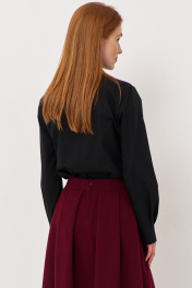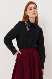 Рубашка прямого кроя с декоративными подвесками по воротнику. Характеристики: выполнена из рубашечной ткани в черном цвете, по воротнику декоративные подвески, центральная застежка на петли и пуговицы, по низу рукавов манжеты с защипами. Длина рубашки по переду 68,5 см, длина рукава 60,5 см.