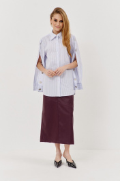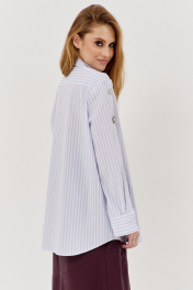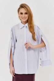 Рубашка свободного силуэта с декоративными рукавами. Характеристики: выполнена из рубашечной ткани в полоску, центральная застежка на петли и пуговицы, по спинке отрезная кокетка, по центру рукава обработана планка на петли и пуговицы, низ рукава обработан манжетой на петли и пуговицы. Длина рубашки по переду 76 см, длина рукава 61 см.