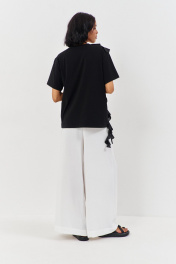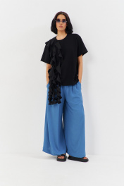 Майка свободного силуэта со спущенным рукавом. Характеристики: выполнена из трикотажного полотна в черном цвете, по переду декоративные детали из шифона, горловина обработана планкой, рукав укороченный. Длина майки по переду 67 см, длина рукава 21 см.