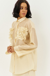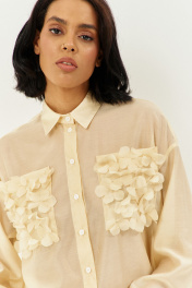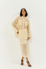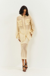 Комплект блузка с юбкой. Блузка свободного силуэта с декоративными карманами по переду. Характеристики: выполнена из блузочной ткани в цвете сливочное масло, центральная застежка на петли и пуговицы, по переду карманы с декоративными цветами, по спинке отрезная кокетка. Длина рубашки по переду 79 см, длина рукава 53 см. Юбка выполнена из блузочной ткани в цвете сливочное масло, пояс обработан эластичной тесьмой (резинкой), по заднему полотнищу юбки обработан разрез. Длина юбки по боковому шву 95 см.